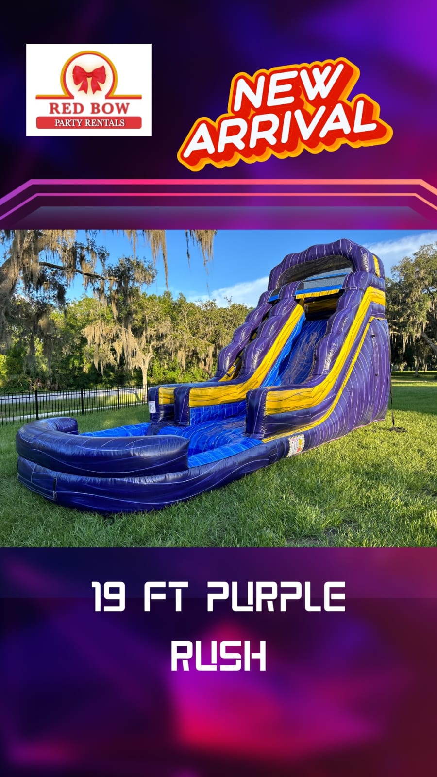 Don't miss out on the opportunity to elevate your event with our 19 Ft Purple Rush Water Slide. Contact us today to reserve this must-have attraction and make a splash at your next gathering in Volusia County, Florida!